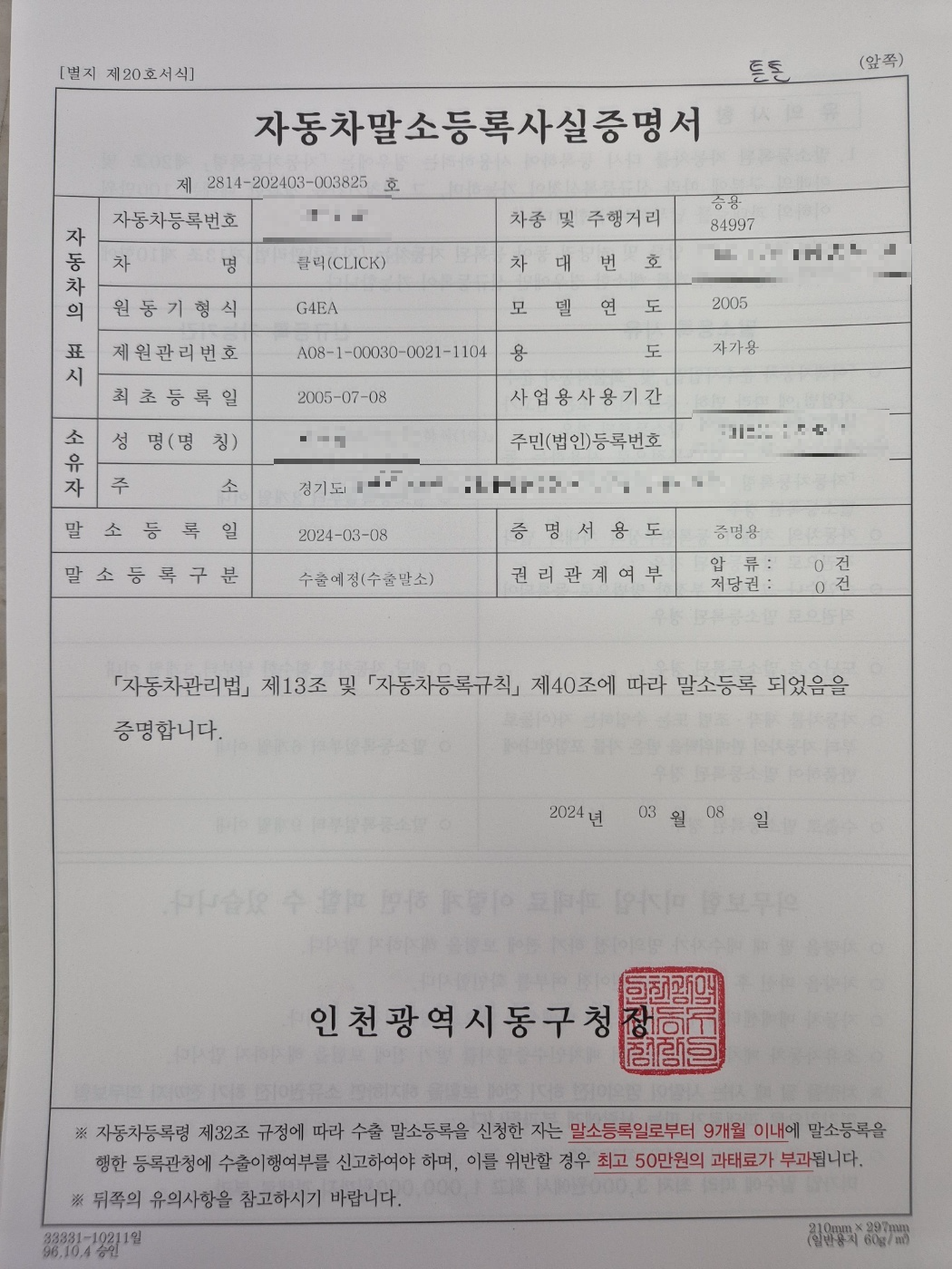 구청에 보낼 말소 서류 정리는